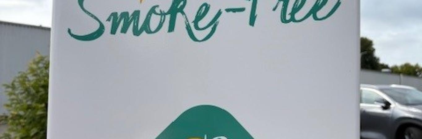 La Haute École UCCL utilise une signalisation en anglais pour indiquer aux étudiants internationaux que le campus est sans tabac.