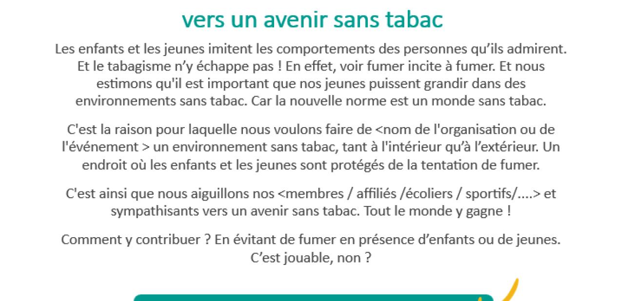 Une administration locale joue un rôle essentiel dans le développement sans tabac et sans nicotine des enfants et des jeunes. Les enfants et les jeunes fréquentent de nombreux espaces publics tels que les terrains de jeux, les terrains de sport, les écoles et les évènements. Si ces environnements sont sans tabac, le sans tabac devient la norme et les enfants et les jeunes seront mieux préparés pour faire face à la tentation des cigarettes et cigarettes électroniques.